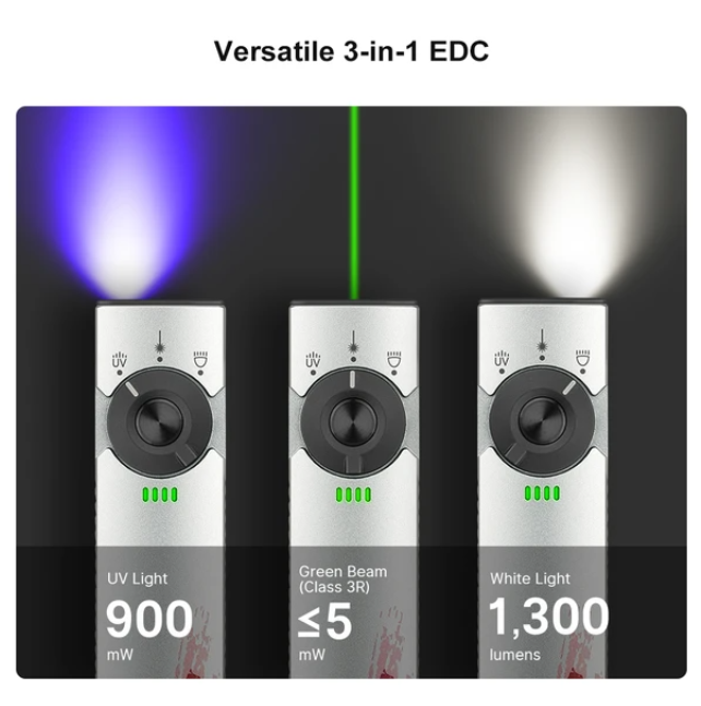 Versatile 3-in-1 EDC: Olight's FIRST rechargeable flashlight that combines 1,300lm white light, 900mW UV light, and Class 3R green laser, offering versatility for a wide range of applications.