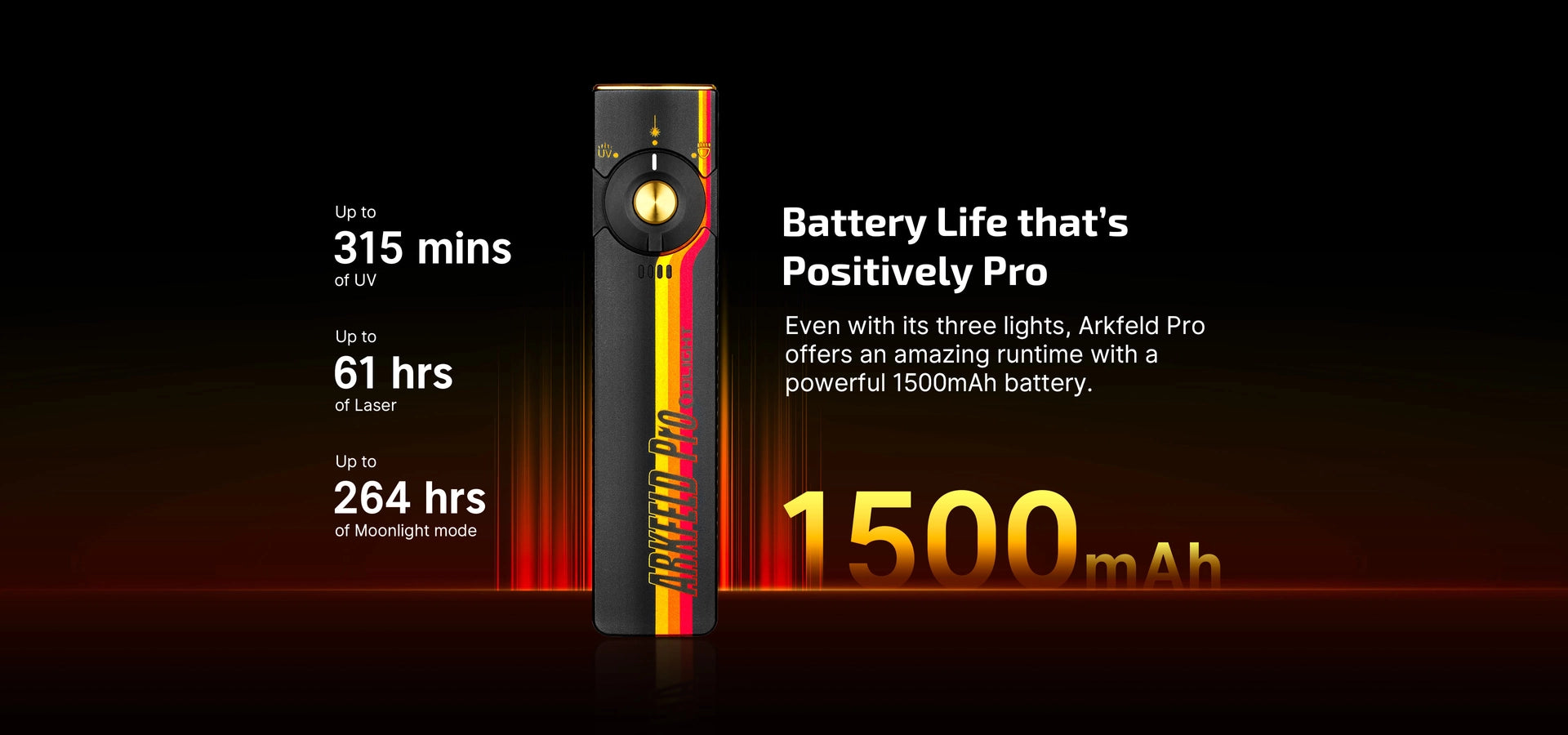 More Capacity, More Runtime: The Pro edition is supported by 1500mAh Lithium Polymer Battery, increased 42.9% from previous Arkfeld, max runtime of 11 days with five-level indicator, kicking your power anxiety out.