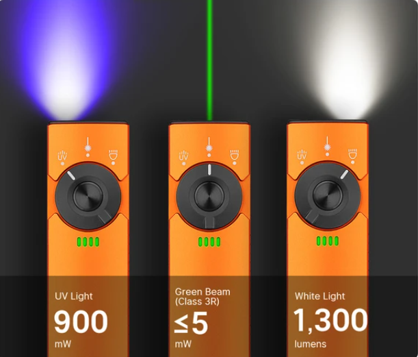 Versatile 3-in-1 EDC: Olight's FIRST rechargeable flashlight that combines 1,300lm white light, 900mW UV light, and Class 3R green laser, offering versatility for a wide range of applications.