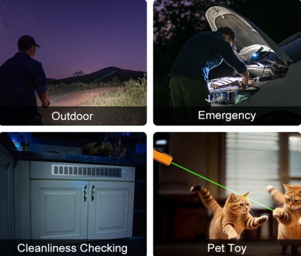 Pro White Light & Green Laser: White light for daily illumination, laser for pets toy / presentation, and the white light and laser can work in tandem for providing targeted point plus overall brightness.