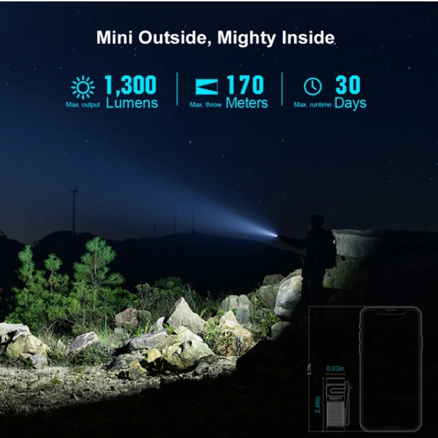 Mini Outside, Mighty Inside: Almost shorter than your index finger. The Baton 4 provides maximum 1,300lm output and 170m throw, and can back you up for up to 30 days.