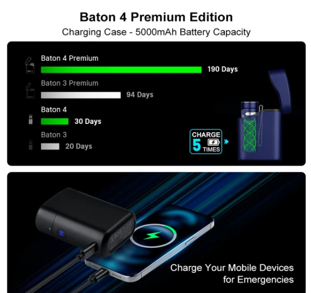 Multi-functional Companion: Powered by a 5000mAh battery, the case can fully charge the Baton 4 flashlight 5 times, giving the flashlight a max runtime of 190 days. It can also charge your mobile devices for emergencies with its USB-C port.