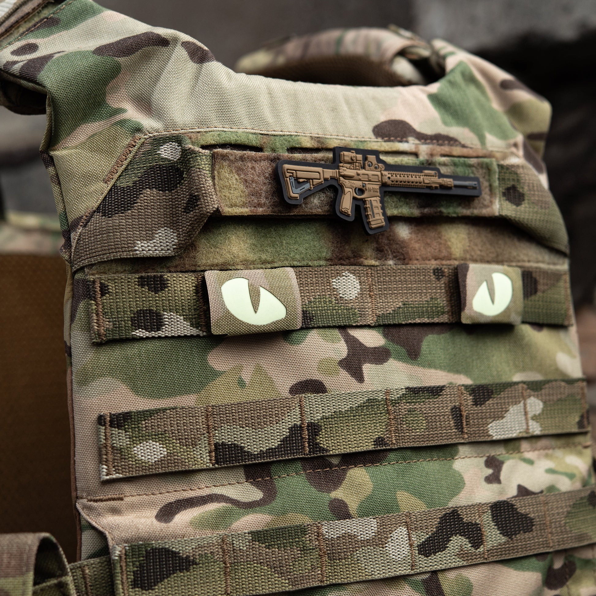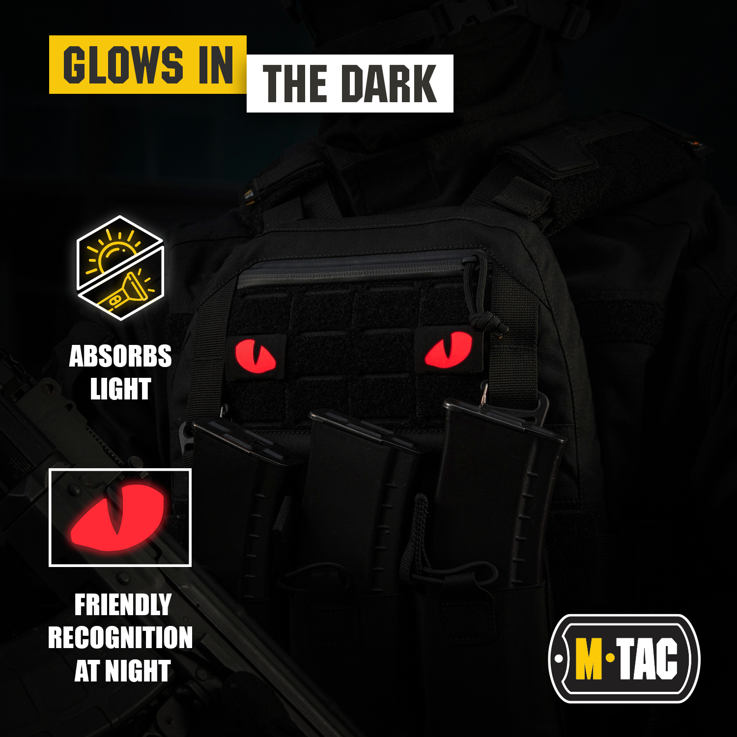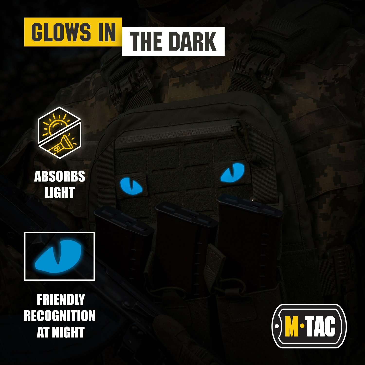 The Tiger eyes patch consists of two parts and is two rectangles measuring 1.5 x 1 inches. Made of Cordura 500D, strong, resistant to abrasion, burning and deformation material and with two cat's eyes depicted on them. The patches attach to the MOLLE interface, rather than to ordinary loop panels with hook and loop fastener. The Eye images are made using Laser Cut technology, which consists in the fact that holes are cut in the material with a laser. The rubberized material is glued between two layers of Cordura, which can accumulate a light charge and glow in the dark. Compact light-accumulative, glow-in-the-dark patches can easily find their place on a backpack, bag or even baseball cap.