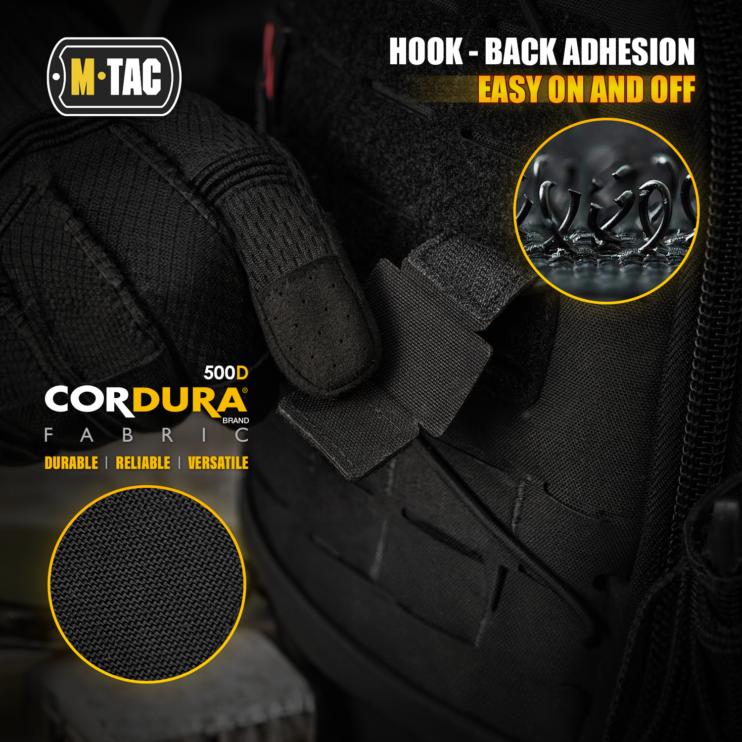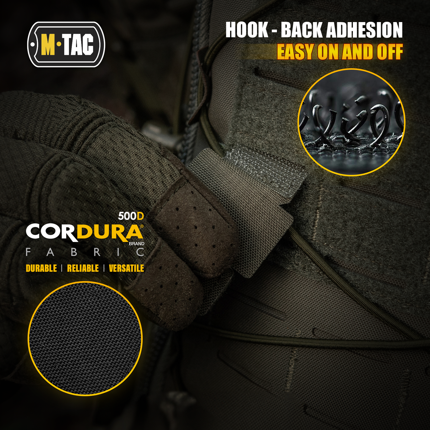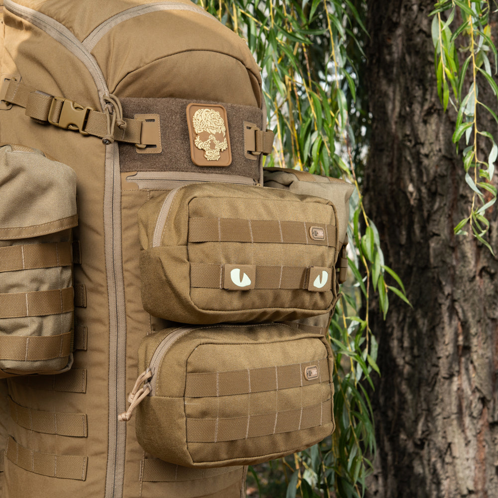The Tiger eyes patch consists of two parts and is two rectangles measuring 1.5 x 1 inches. Made of Cordura 500D, strong, resistant to abrasion, burning and deformation material and with two cat's eyes depicted on them. The patches attach to the MOLLE interface, rather than to ordinary loop panels with hook and loop fastener. The Eye images are made using Laser Cut technology, which consists in the fact that holes are cut in the material with a laser. The rubberized material is glued between two layers of Cordura, which can accumulate a light charge and glow in the dark. Compact light-accumulative, glow-in-the-dark patches can easily find their place on a backpack, bag or even baseball cap.