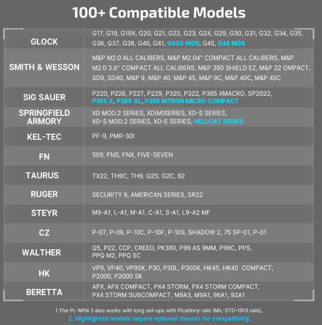 Superior Versatility: Equipped with a preinstalled Picatinny rail mount, and Hellcat, GL, and 1913 rail adapters, plus optional G43X MOS rail, P365 rail, and quick-release rail, this light reaches new heights of adaptability. (The 3 optional rails will be available next month.)