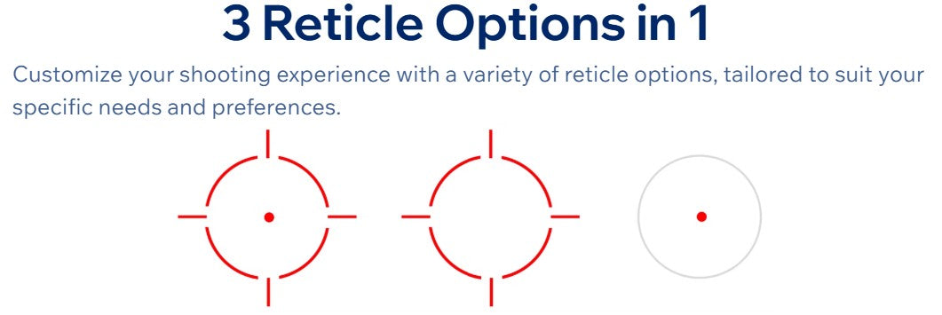 - Multiple Reticle Options: 3 MOA Dot + 32 MOA Circle, 32 MOA Circle, 3 MOA Dot.